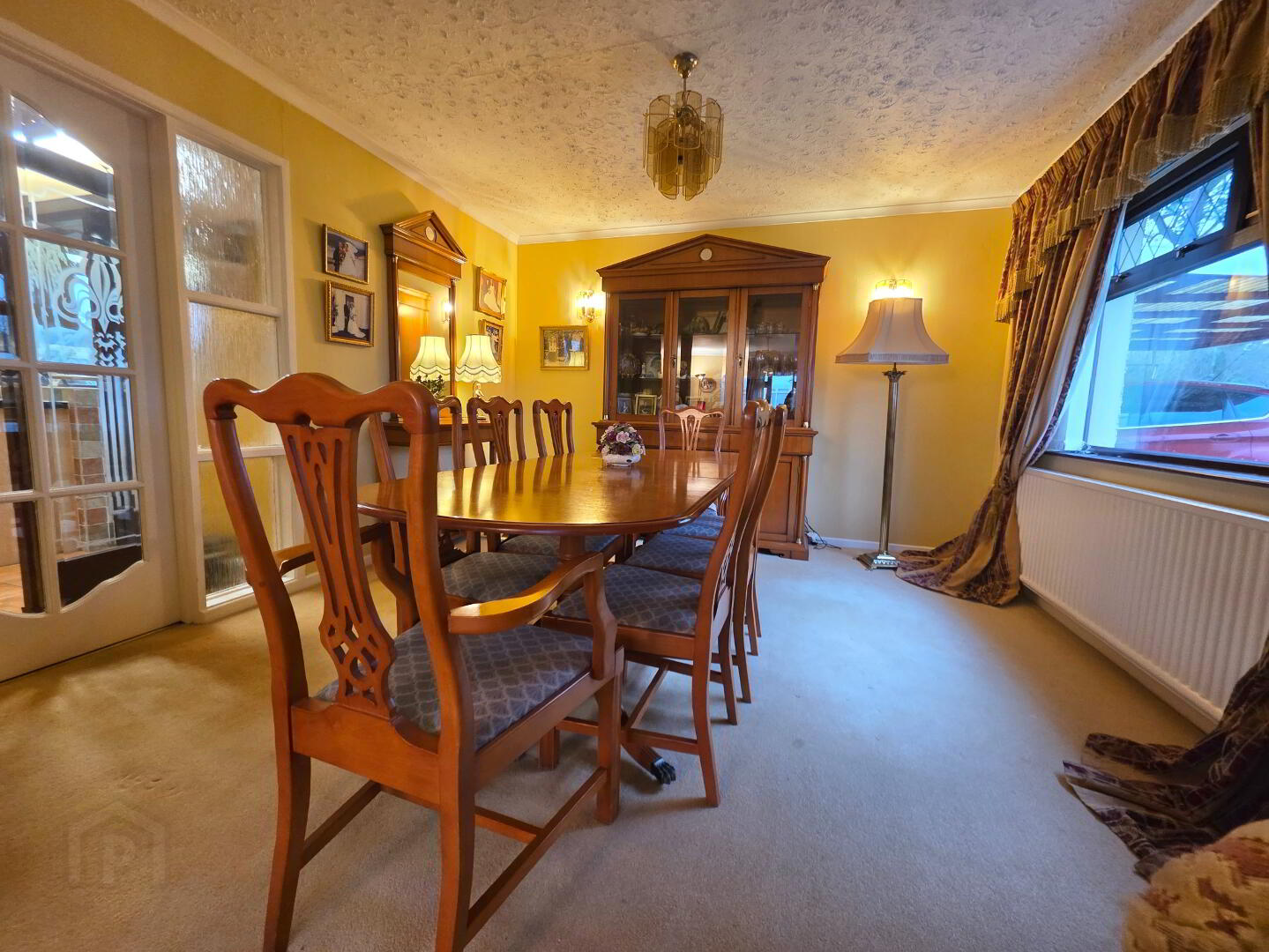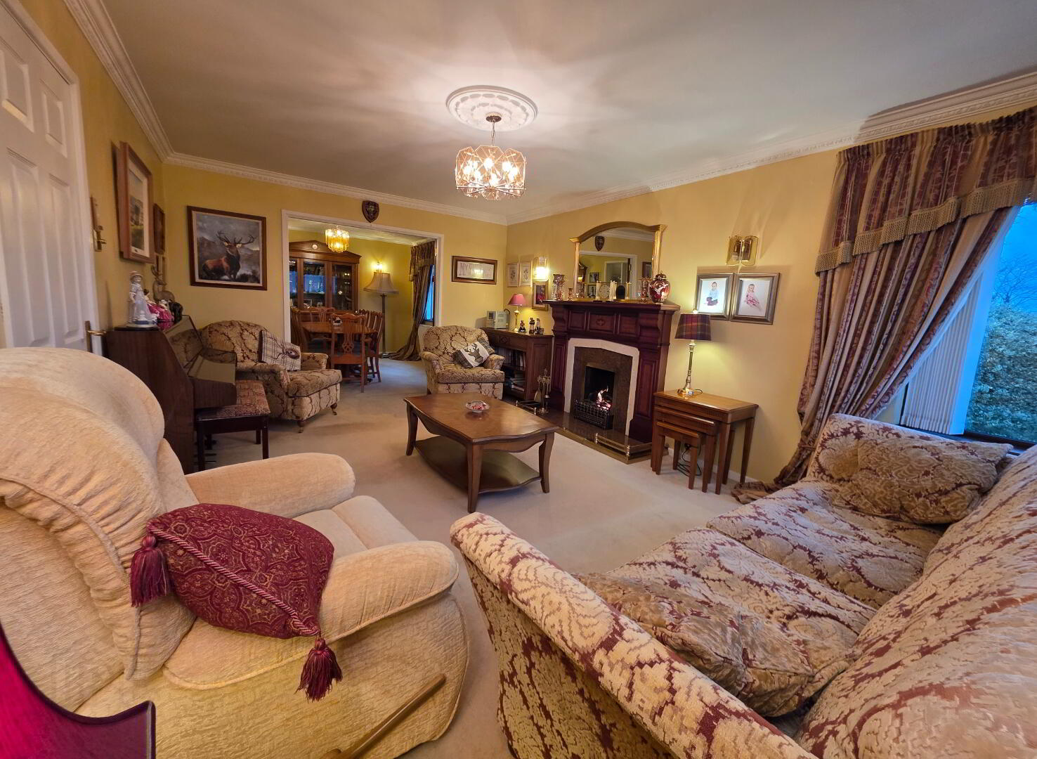 18'0 x 12'0 With feature mahogany fireplace having granite and marble inset, granite hearth, feature corner window with superb views looking towards Slemish mountain, plaster moulded cornice and centrepiece, double fully glazed french doors into;
