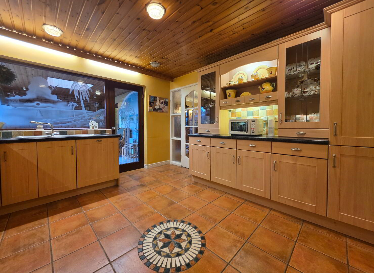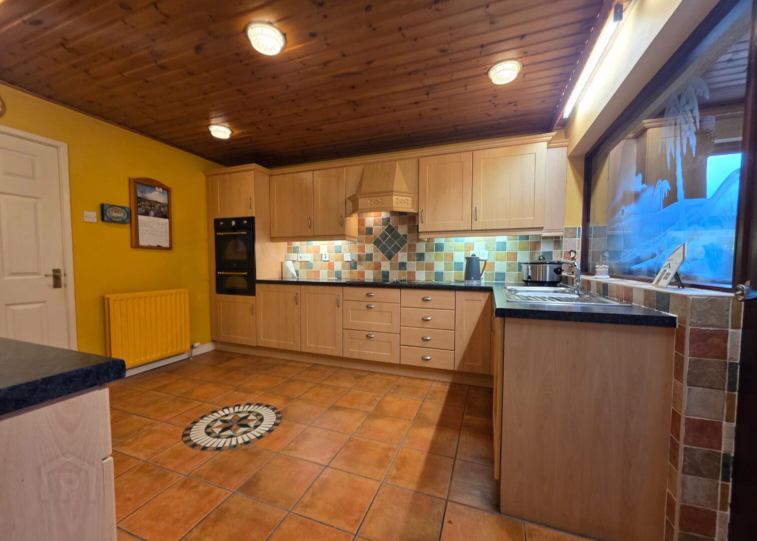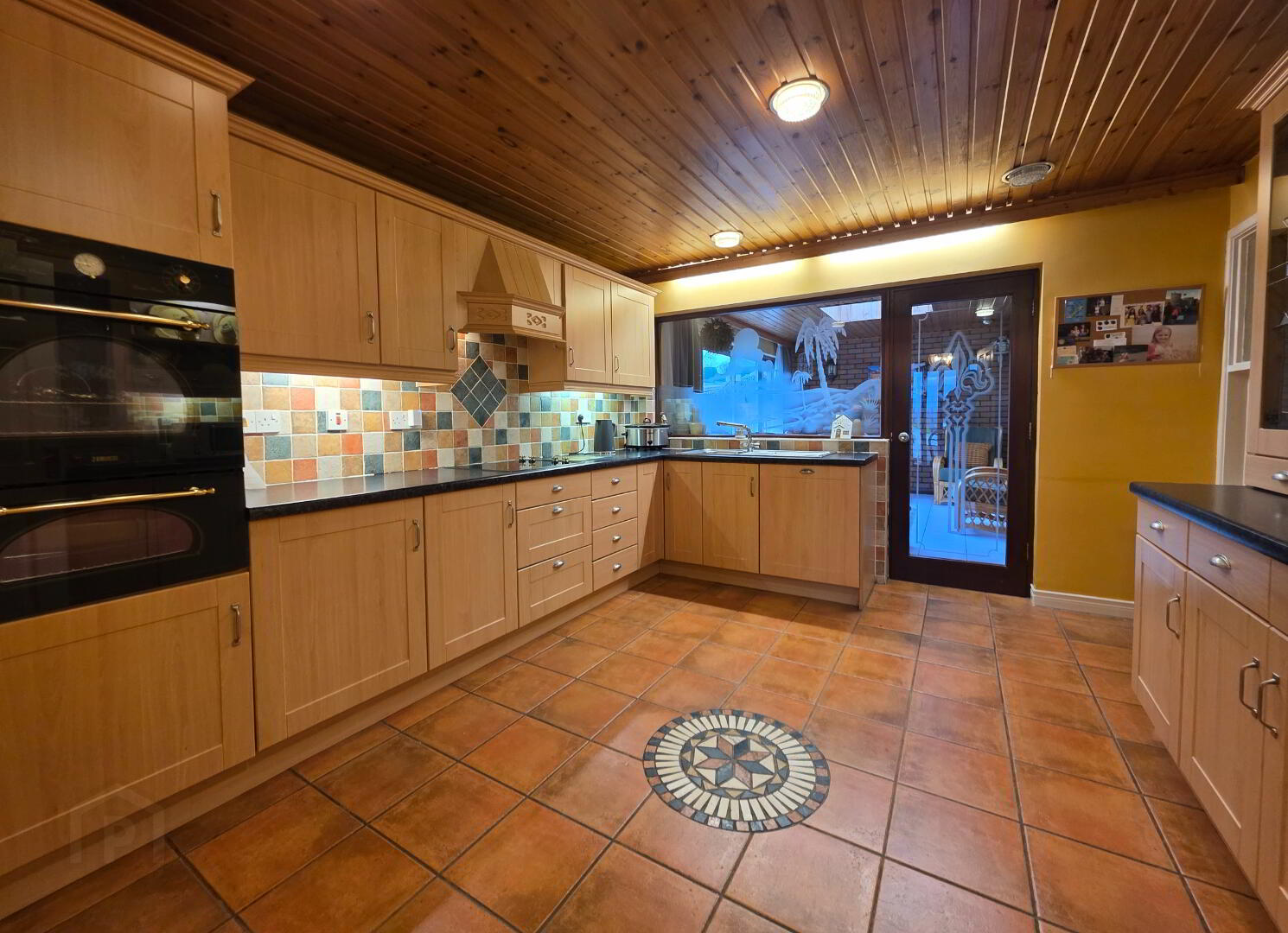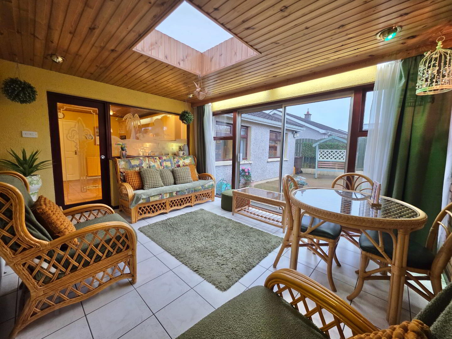 With most attractive 'Beech' shaker styled fully fitted eye and low level units incorporating a good 'Creda' ceramic hob with extractor fan over, 'Zanussi' double oven/grill, one and a half single drainer stainless steel sink unit, 'Bosch' integrated dishwasher, 'Beko' fridge/freezer, tiled floor, tiled between eye and low level units, Fully glazed door into;