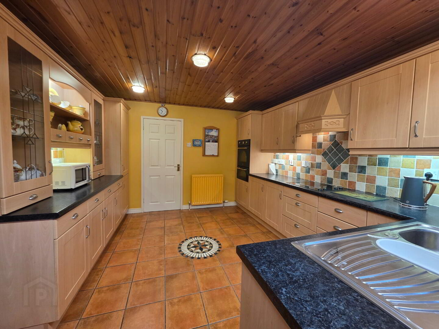 8'10 x 7'0 With fully fitted eye and low level units, single drainer stainless steel sink unit, left plumbed for automatic washing machine, tiled floor. (Access to integral garage)