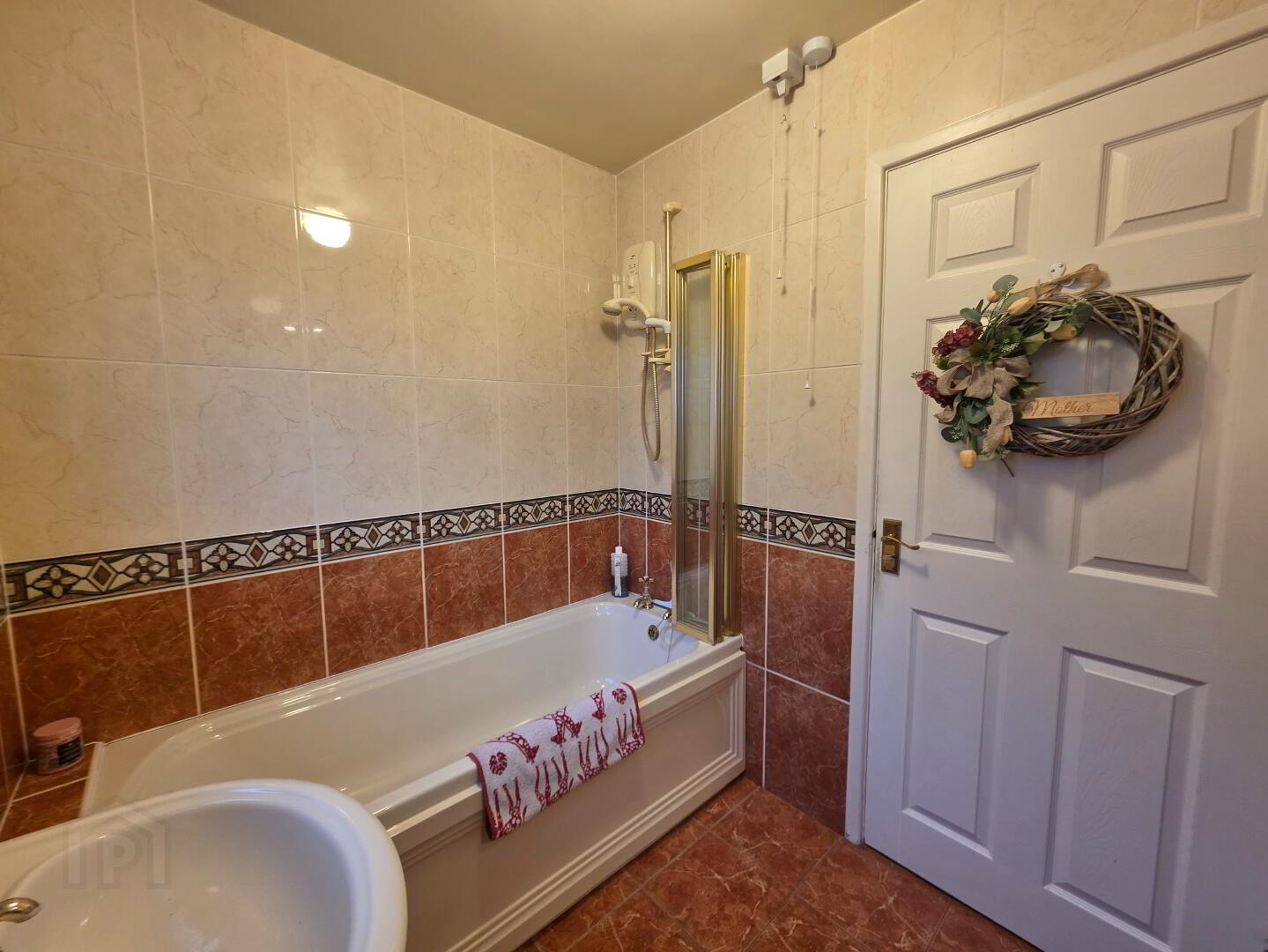 7'0 x 5'10 With white suite, with 'Mira' Sport electric shower over bath with screen, fully tiled walls, tiled floor, tiled floor.
