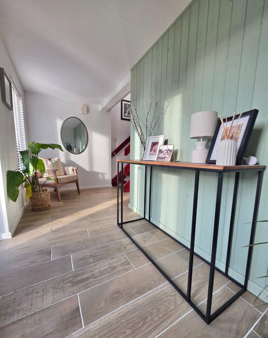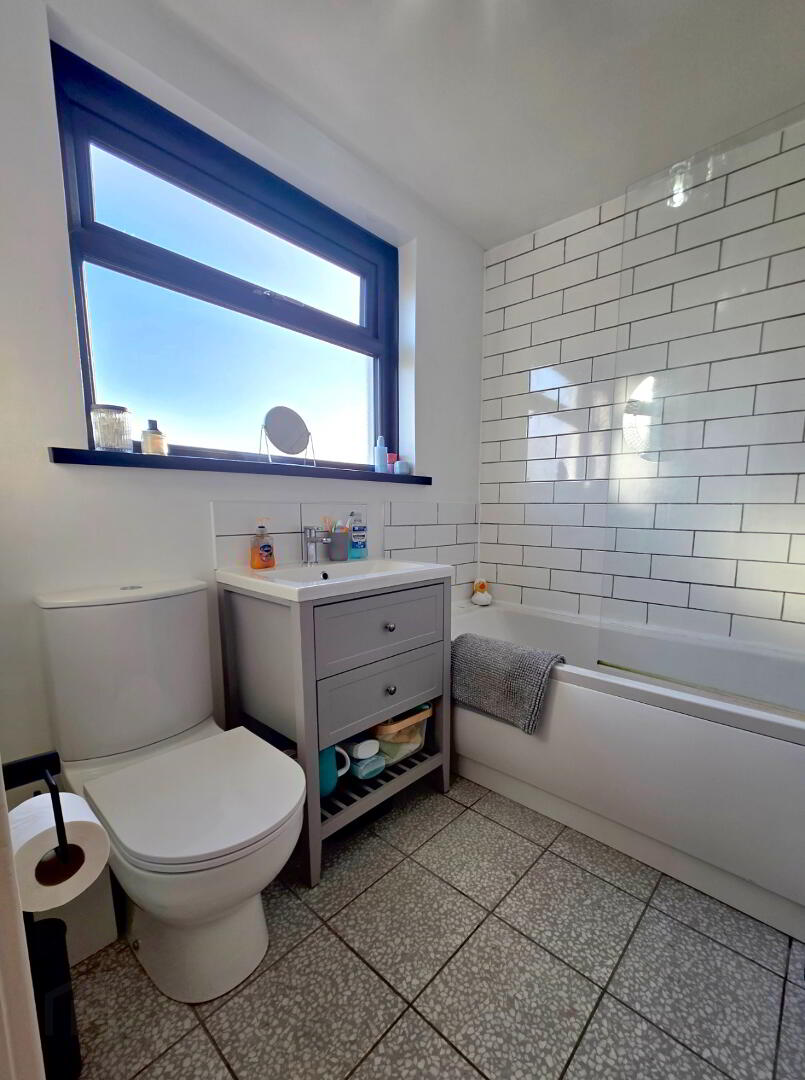 6'6' x 5'9 With white suite, shower over bath with 'Mira Atom' thermostatic controlled shower system complete with screen, fully tiled around bath, vanity unit.