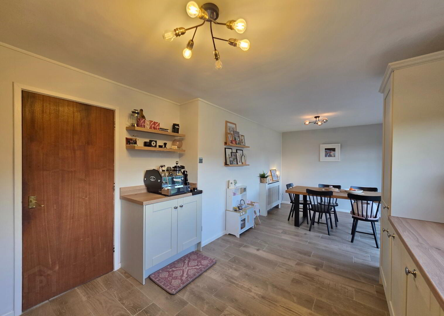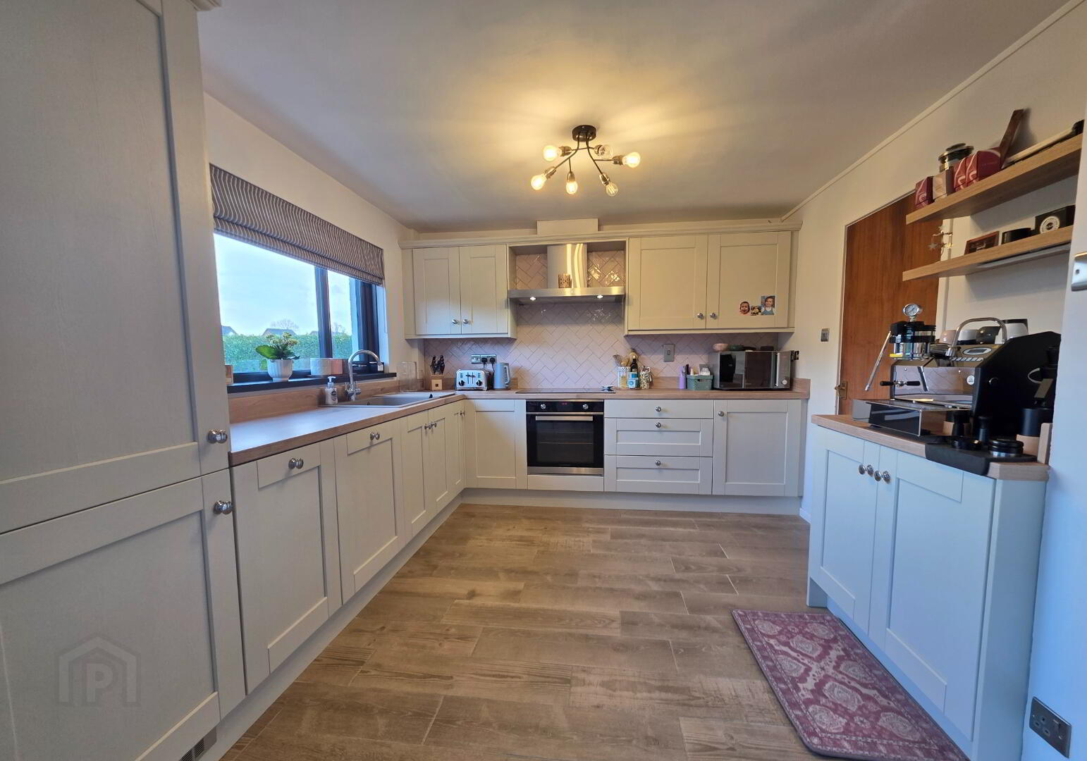 21'10 x 10'5 With 'Shaker' styled fully fitted eye and low level units finished with chrome door furniutre, incorporating 'Nordemende' induction ceramic hob with matching under oven, modern stainless steel extractor fan, 'Nordemende' integrated dishwasher, 'Nordemende' integrated fridge/freezer, integrated pull-out double bins, modern sink unit with mixer tap, saucepan drawers, tiled floor.