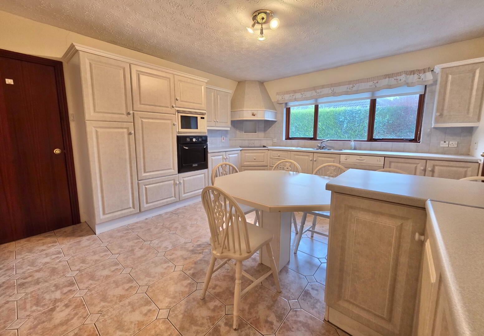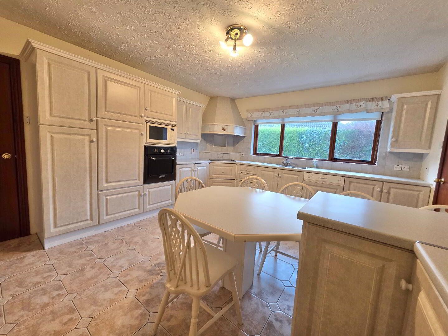 15'0x 13'0 With a good 'Orlee' fitted kitchen having an extensive range of eye and low level units with combined dining table. The kitchen incorporates a 'Belling' ceramic hob with feature corner canopy with extractor fan, 'Baumatic' electric fan oven, 'Bosch' integrated microwave oven, 'Whirlpool' integrated dishwasher, one and a half bowl single drainer stainless steel sink unit, glazed display cabinet with light, tiled floor, tiled between eye and low level units.