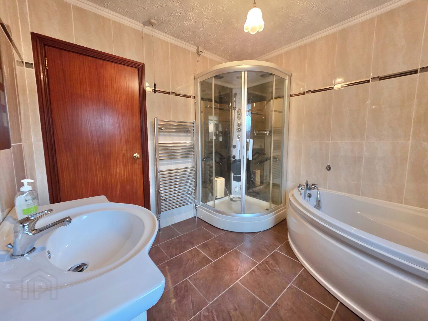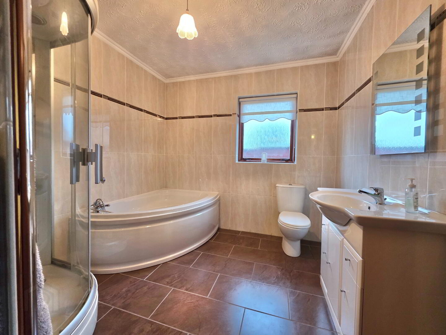 8'8 x 8'8 With feature corner bath having telephone hand shower attachment, vanity unit, shower capsule complete with body sprays and accessories, fully tiled walls, tiled floor, wall mounted heated towel rail, fitted wall mirror.