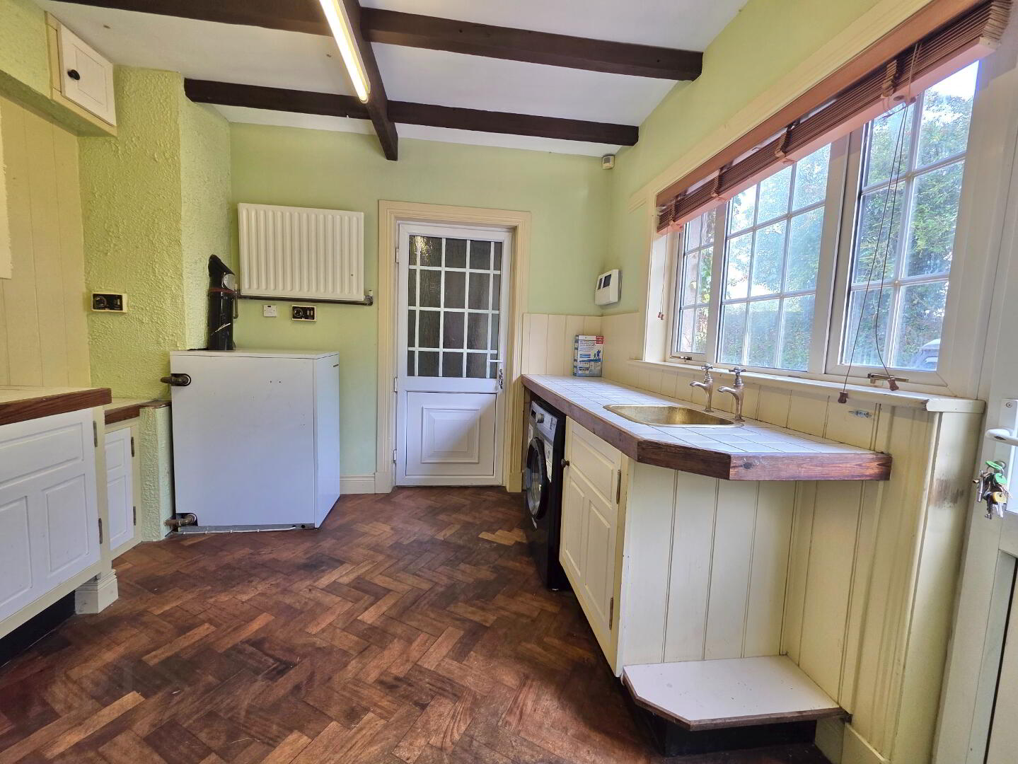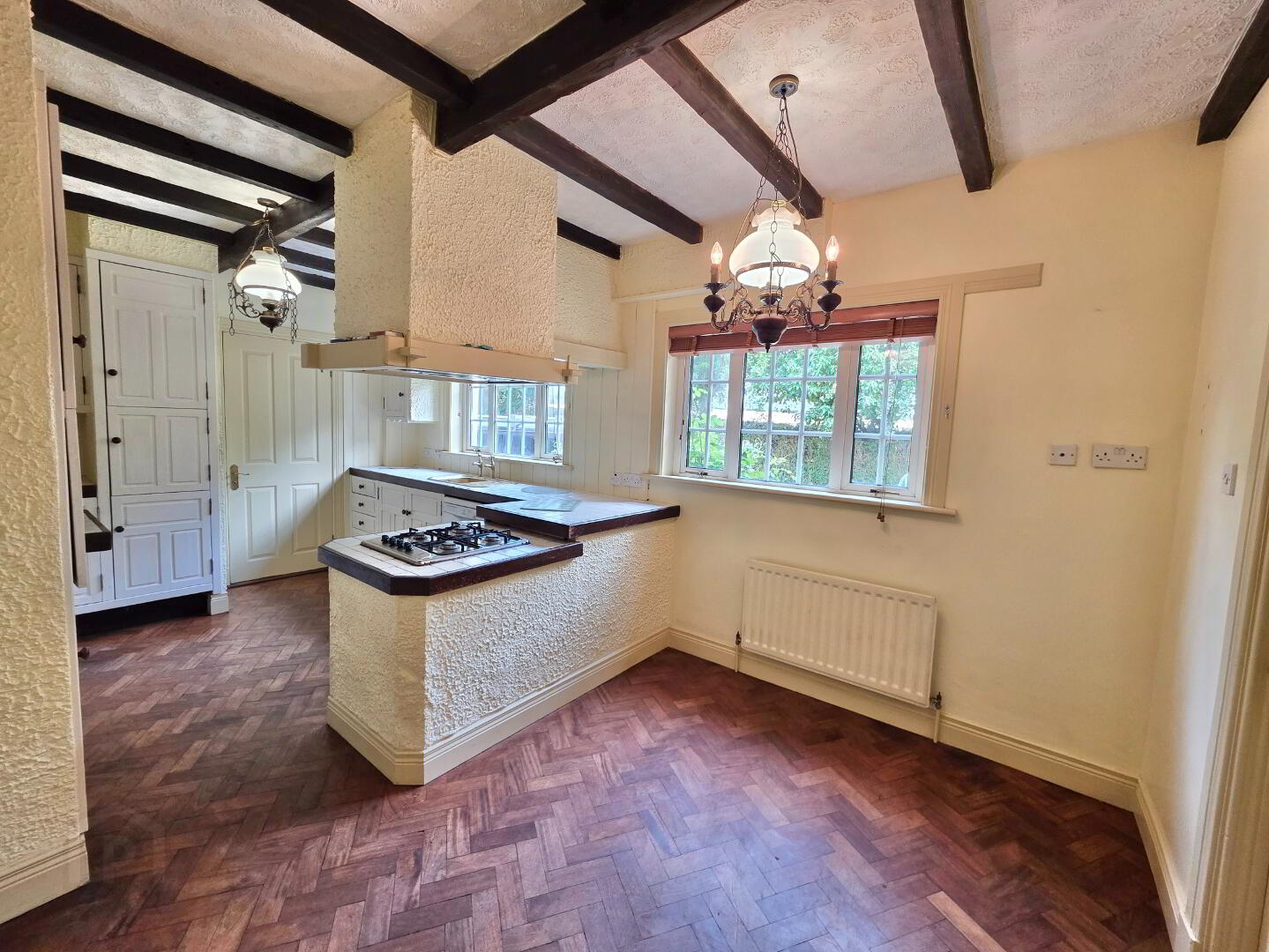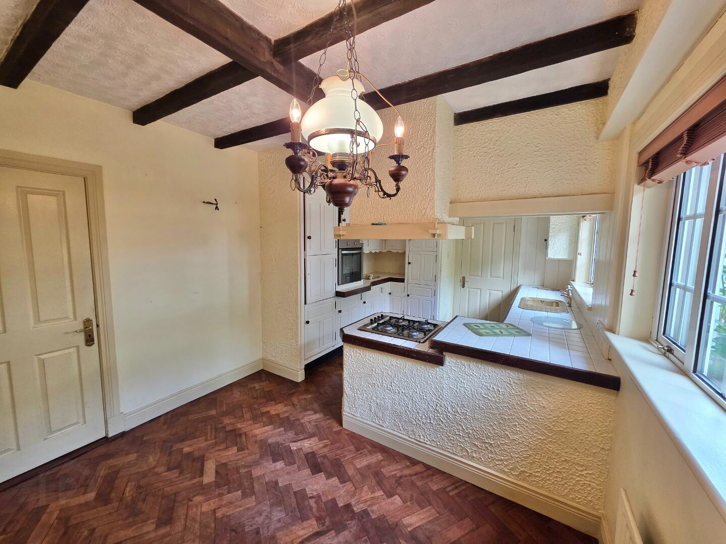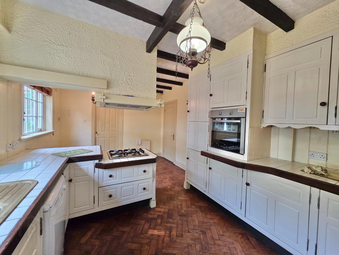 17'7 x 10'8 With an extensive range of fully fitted eye and low level units incorporating a 'Neb' 4 ring stainless steel hob, an eye level 'Logik' electric fan oven, single drainer sink unit, larder unit, extractor fan, beamed ceiling, 'Parquet' wooden floor, plaster moulded cornice,.