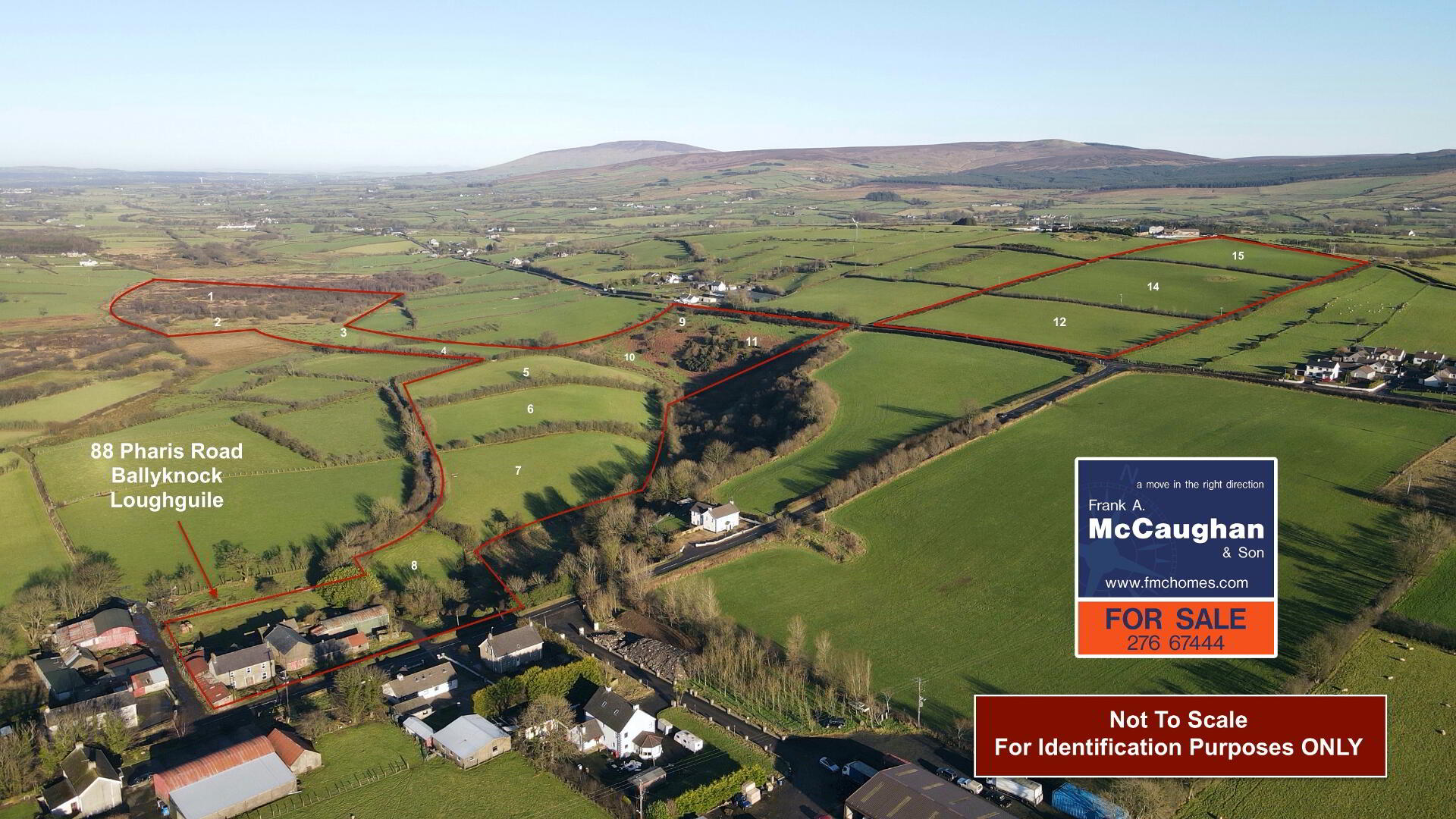 We are pleased to offer for sale this compact block of lands together with adjoining disused farmhouse situated at 88 Pharis Road Loughgiel. The lands are located within a strong farming community approximately 1.5 miles from the village of Loughgiel and approximately 7.5 miles from both the neighbouring towns of Ballymoney and Ballymena.